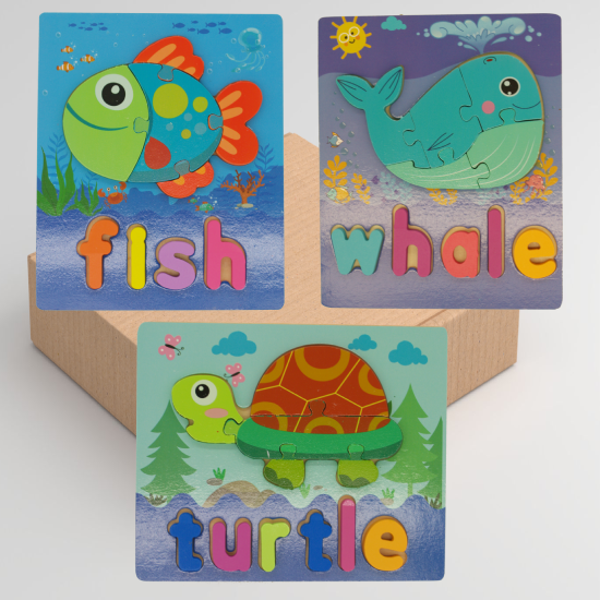 Descobre o Pack de 3 puzzles em madeira (baleia, peixe e tartaruga), que ensina as letras e desenvolve habilidades com criatividade e cor.